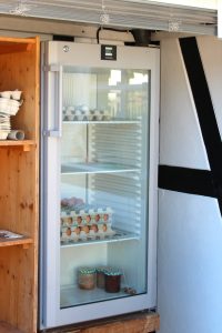 Falls Ihnen einmal die Eier ausgehen, können Sie jederzeit außerhalb der Öffnungszeiten welche aus unserem 24h-SB-Eierkühlschrank holen.